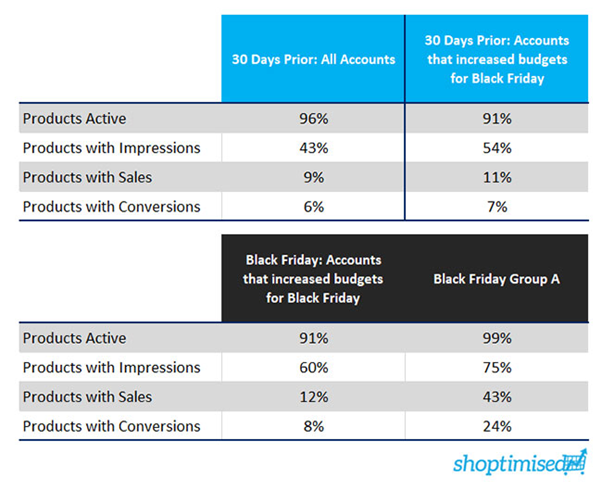 To understand the impact of Google Shopping campaign structure against budget, we analysed 100 accounts for 30 days prior to Black Friday and on the actual day of Black Friday.